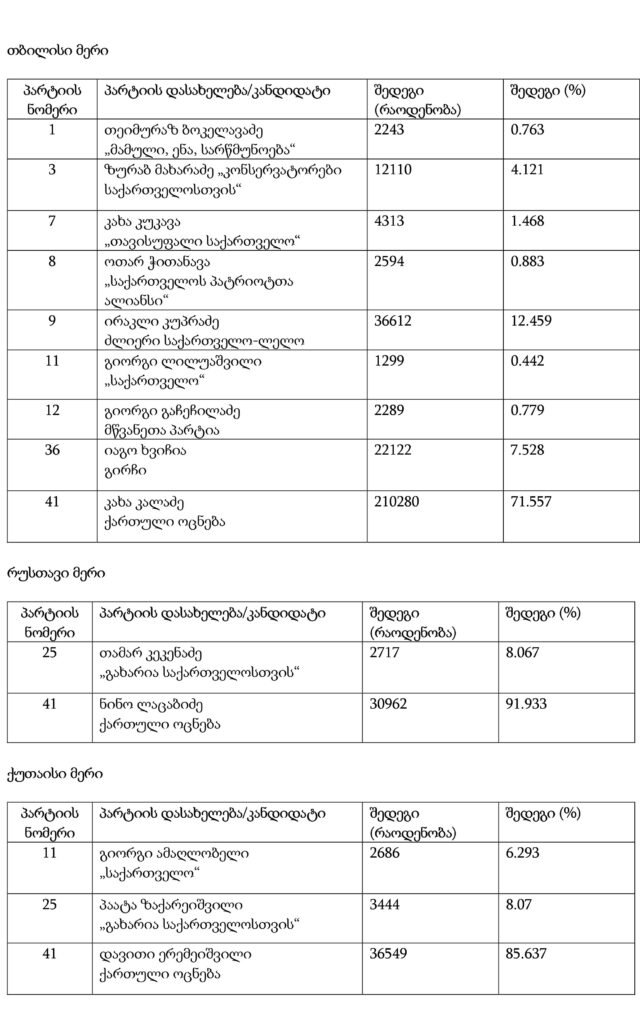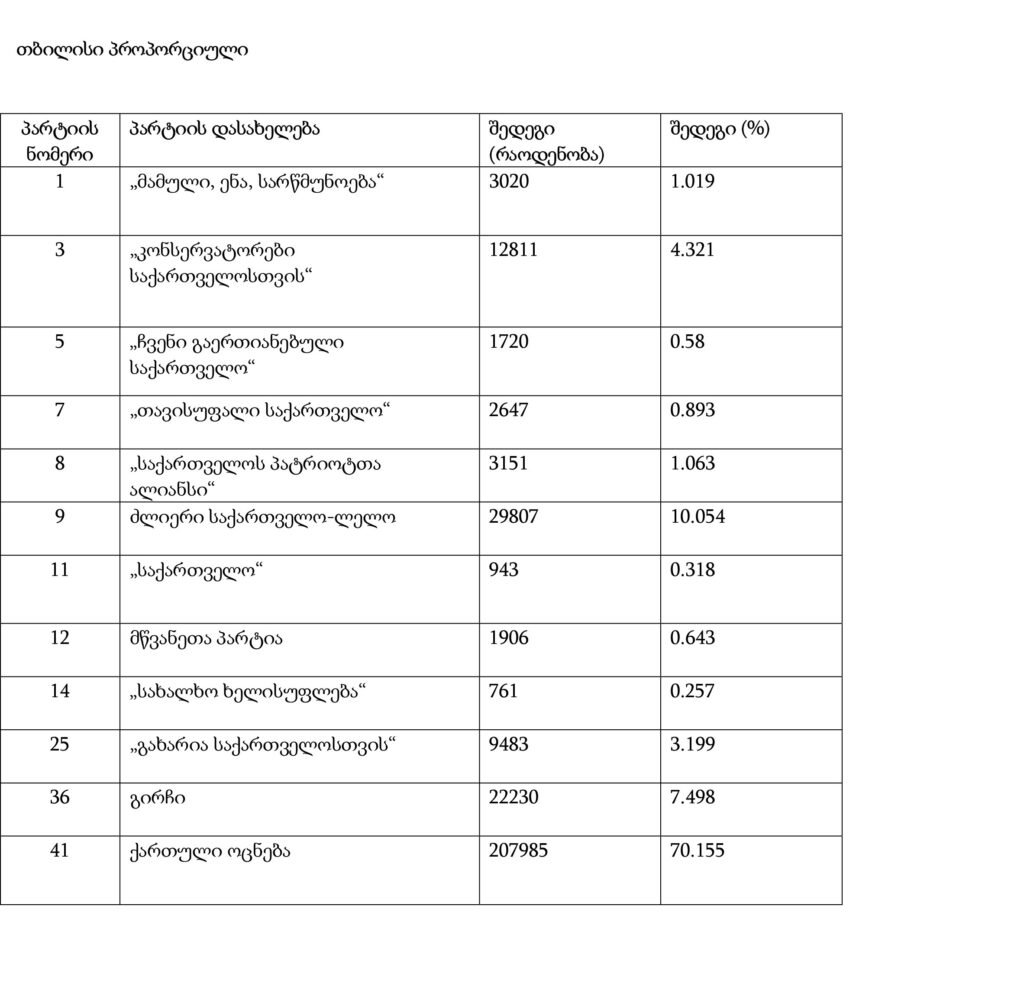 დედაქალაქის პროპორციულ შედეგებს, ასევე თბილისისა და დანარჩენი თვითმმართველი ქალაქების