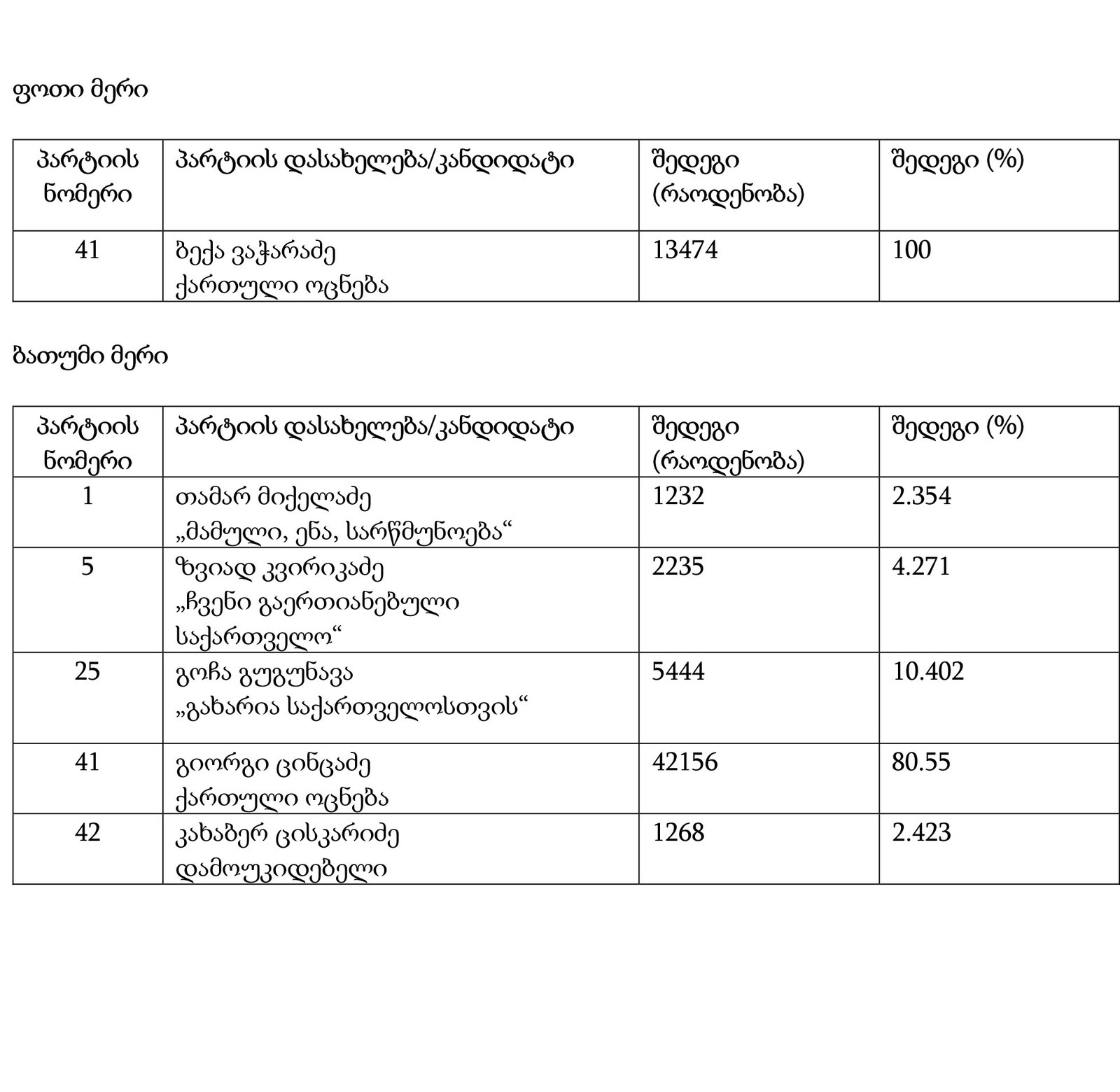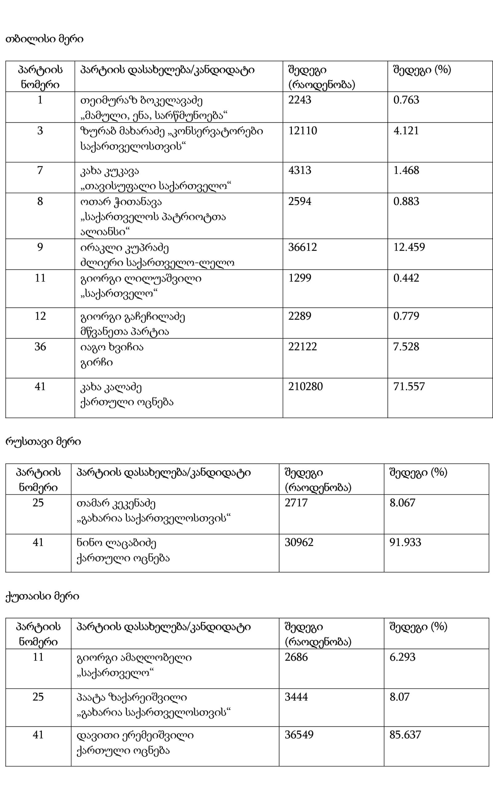 დედაქალაქის პროპორციულ შედეგებს, ასევე თბილისისა და დანარჩენი თვითმმართველი ქალაქების